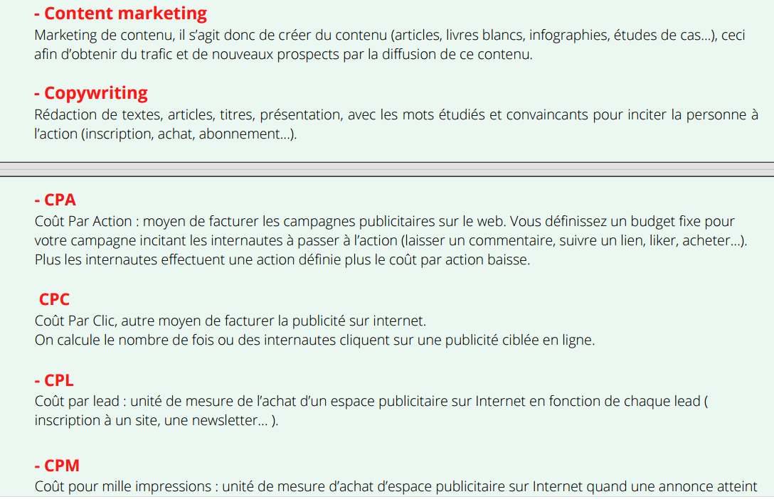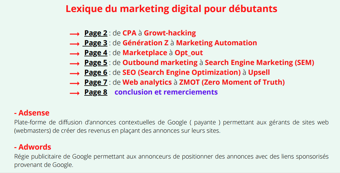 Voici le sommaire de cet Ebook des termes marketing à connaitre sur le bout des doigts !